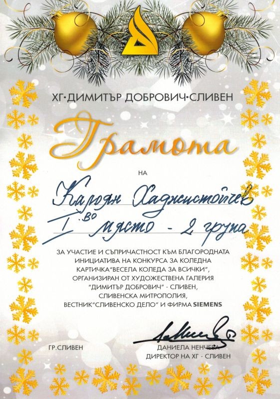 В 11 Национален конкурс за Коледна картичка под надслов „Весела Коледа за всички“ организиран от Художествена галерия „Димитър Добрович” – Сливен във възрастова група 1 – 2 клас Калоян Милков Хаджистойчев от 1 „б” клас при ОУ „Елисавета Багряна“ спечели I място.