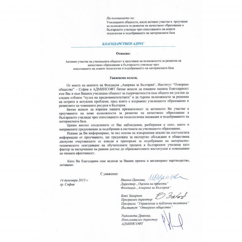 Оценката за нашата работа може да видите в получения благодарствен адрес в прикачения файл.