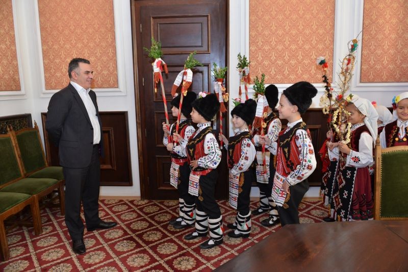 Деца от фолклорния танцов ансамбъл „Тракийче” при Детския комплекс Сливен коледуваха днес при кмета Стефан Радев, стопанин на града.