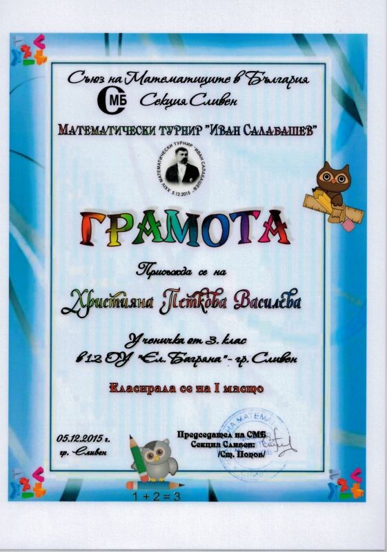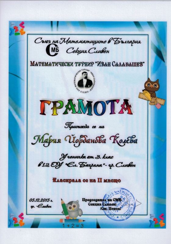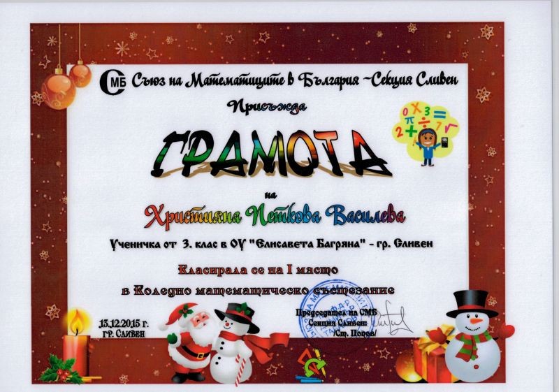 За пореден път нашите талантливи деца Християна Василева от 3 „в” клас и Мария Колева от 3 „в” клас при ОУ „Елисавета Багряна” се представиха достойно и бяха отличени с призови места в Коледното математическо състезание и в математическия турнир „Иван Салабашев”, организирани от Съюза на математиците в България. Ученичките получиха медали и грамоти за отличното си представяне. Децата бяха лично поздравени от директора на училището г-жа Величка Христова.
