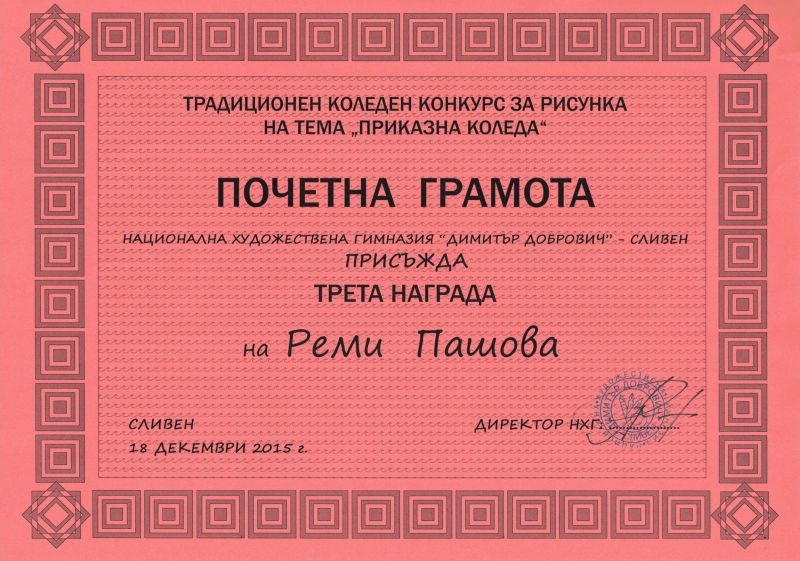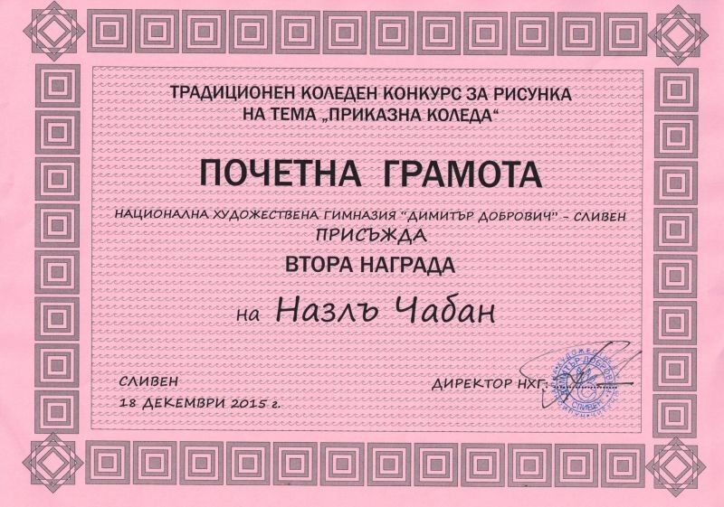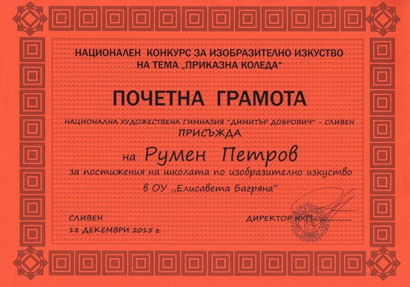 За поредна година учениците от ОУ „Елисавета Багряна” участваха в традиционния коледен конкурс за рисунка „Приказна Коледа” организиран от Националната художествена гимназия „Димитър Добрович” – Сливен. Ученичките Назлъ Риза Чобан от 5”в” клас спечели II награда, а Реми Ивайлова Пашова от 4”в” клас спечели III награда. Г-н Румен Петров – учител по изобразително изкуство в ОУ „Елисавета Багряна” също получи грамота за постиженията на талантливите участници от училището.