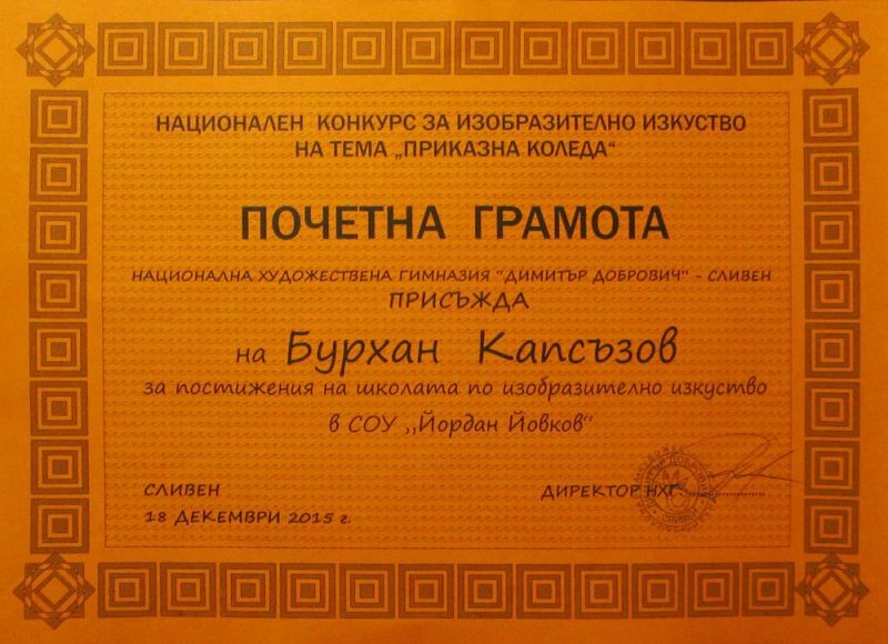 Почетна грамота получи и г-н Бурхан Капсъзов за постижения на школата по изобразително изкуство в СОУ "Йордан Йовков".
