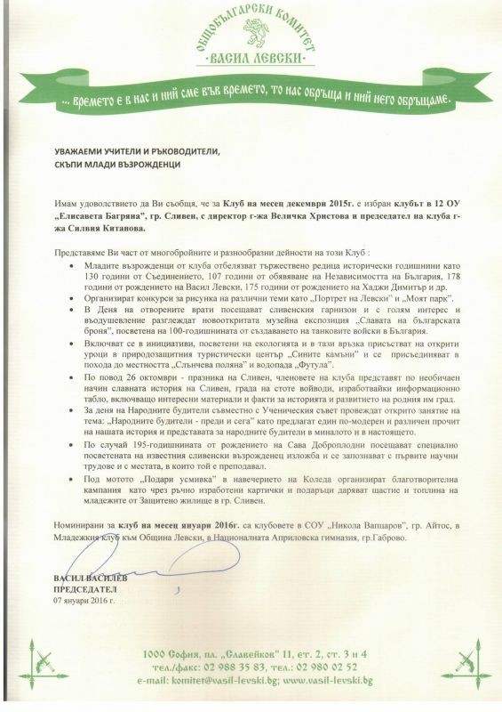 За своите добри идеи, дела и постижения клуб „Млади възрожденци” на 12 ОУ „Елисавета Багряна” бе избран за Клуб на месец декември 2015 г. от председателя на Общобългарски комитет „Васил Левски” – г-н Васил Василев.