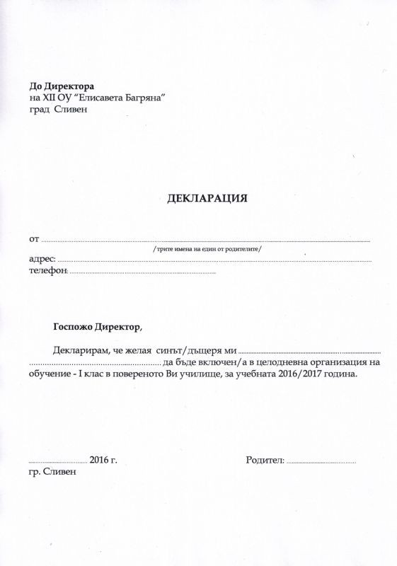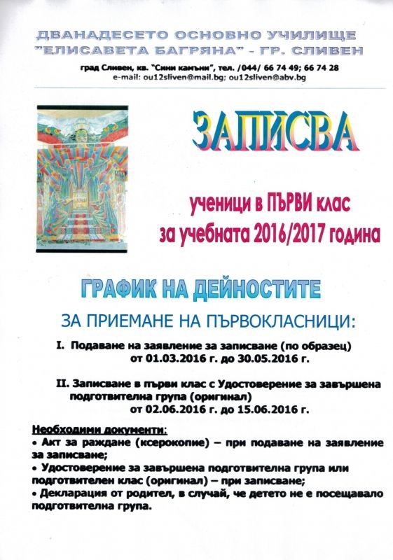Уведомяваме Ви, че в 12 ОУ „Елисавета Багряна” – град Сливен от 01.03.2016 г. започва прием на документи за записване на ученици в 1 клас за учебната 2016/2017 година.