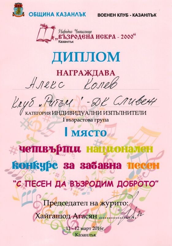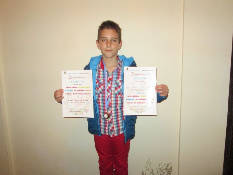 Ученикът Алекс Николаев Колев от 3”б” клас се класира на I-во място в категория индивидуални изпълнители в 1-ва възрастова група, за което получи диплом и медал, връчен му от композитора Хайгашод Агасян. Алекс Колев е възпитаник на клуб "Ритъм" към Детски комплекс Сливен, с ръководител г-жа Елена Пеева.