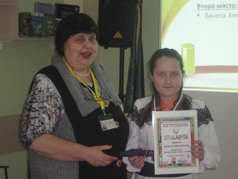 На 17.03.2016 г. в РИО – Сливен се проведе официално награждаване на участниците в IV областен математически турнир "Проф. д-р "Д. Табаков", организиран от Съюза на Математиците в България – секция Сливен. Госпожа Бисерка Михалева началник на РИО – Сливен лично връчи наградите на заслужилите математици.