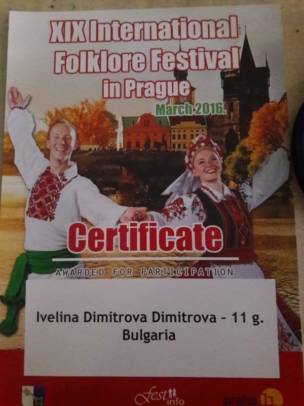 Ученичката Ивелина Димитрова от 5а клас участва в международен фестивал в Прага, Чехия. Там й бе присъден златен медал за изпълнението на народни песни "Залюбила е малка мома" и "Слънчице мило мамино".