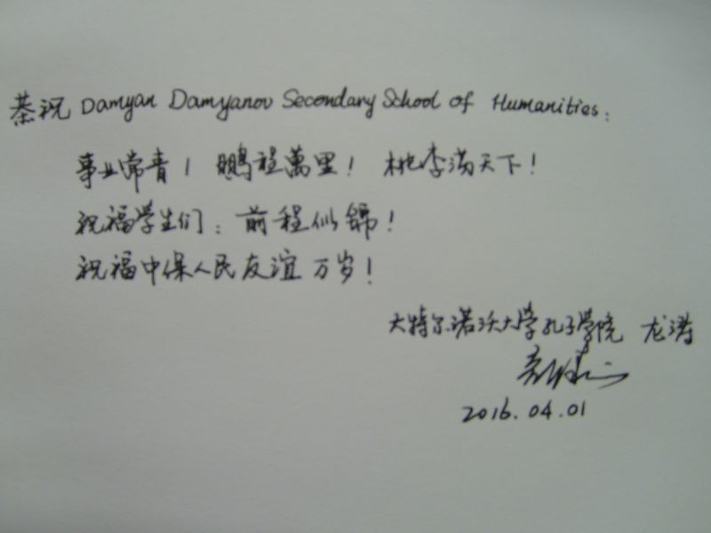 Гостът написа няколко реда в паметната книга на гимназията. Пожеланията му са доброто начало на взаимоотношенията ни да доведе до добри бъдещи резултати, хуманитарното образование да продължи да бъде полезно за младите хора и за обществото като цяло, а китайският език да отвори за нашите ученици още един прозорец към света.