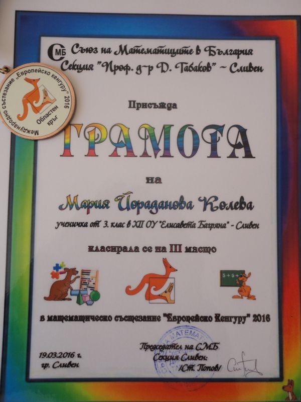 Ученичката Мария Йорданова Колева от 3”в” клас от ОУ „Елисавета Багряна” – Сливен се класира на 3-то място с 85 точки в математическо състезание „Европейско Кенгуру” 2016 във възрастова група 3 клас, областен кръг.