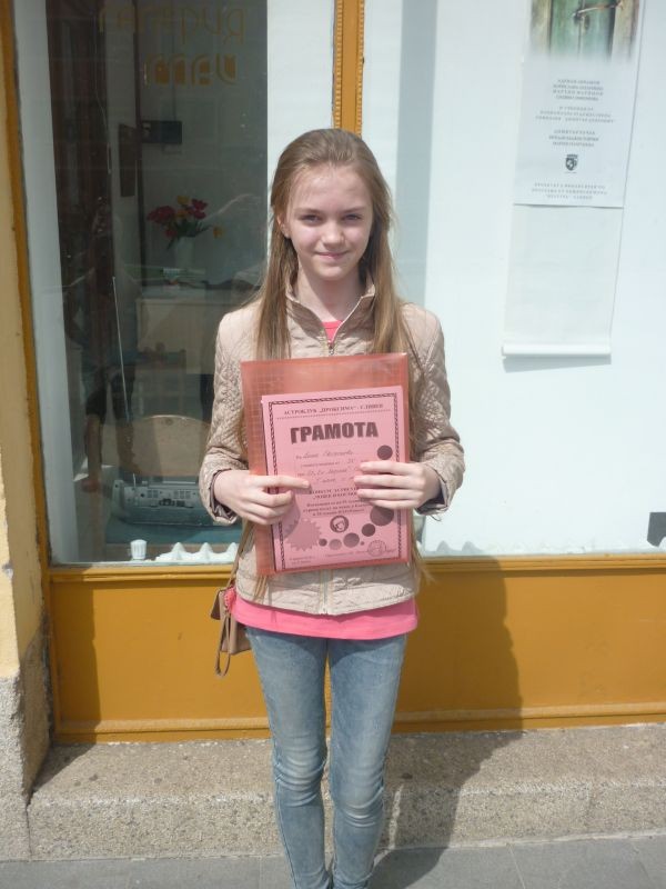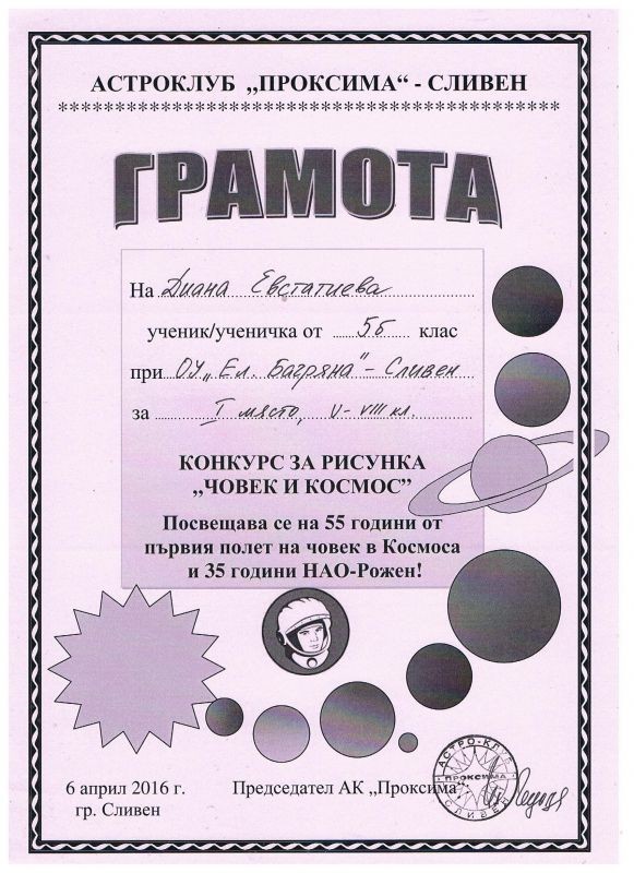 В конкурса „Човек и Космос” на Астроклуб „Проксима” провел се на 31 март 2016 г. са получени следните награди: