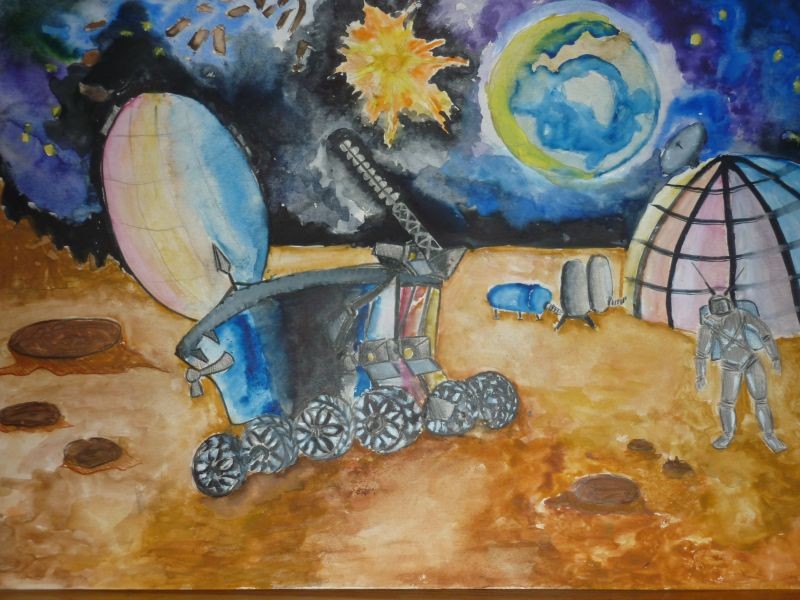В картината си „Станция на Луната” Диана Евстатиева показва лунен робот (Луноход) както и куполоподобна станция от бронирано стъкло и астронавт до нея.