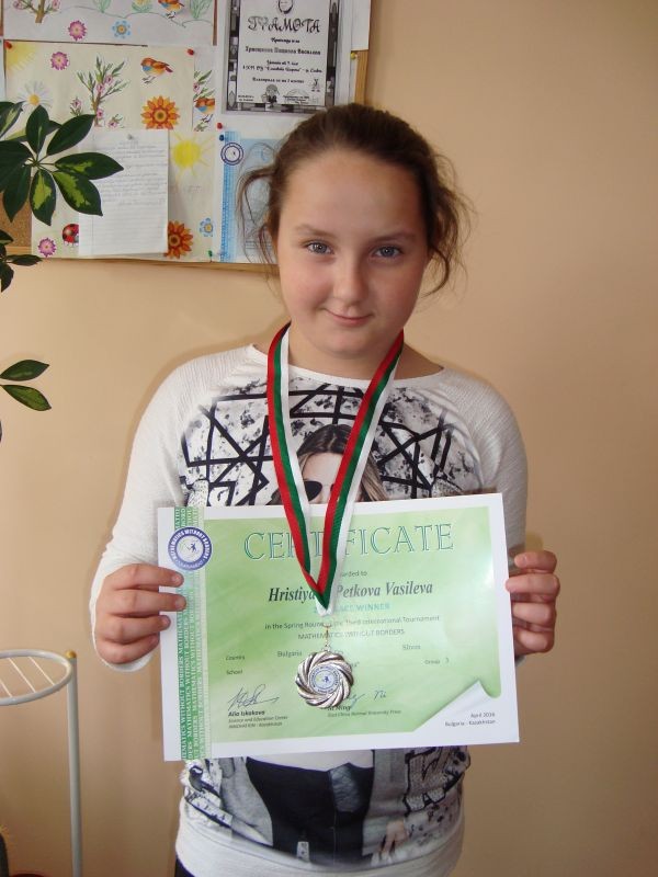 Талантливата математичка Християна Петкова Василева от 3 „в” клас бе наградена със сребърен медал и грамота за участието си в Международното състезание „Математика без граници”.