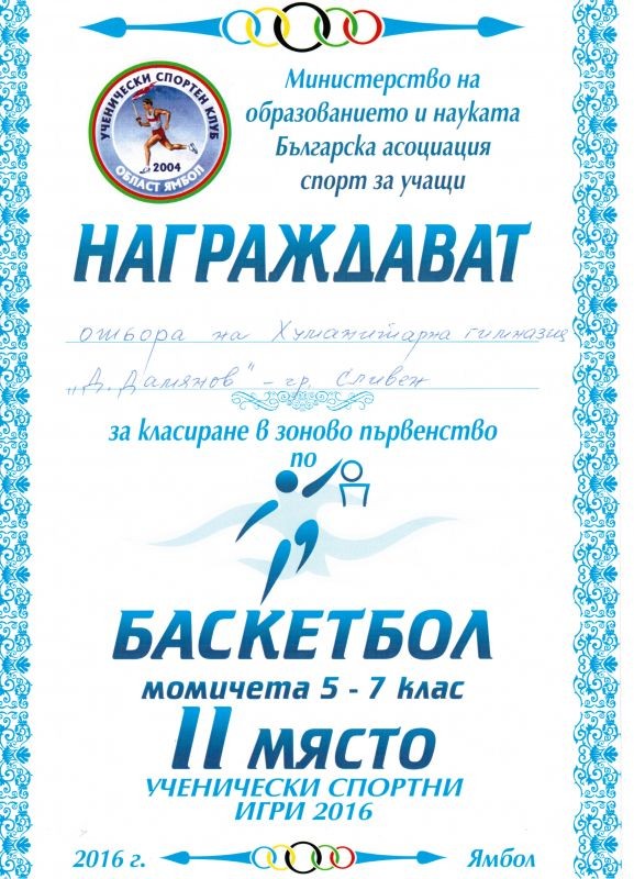 На 16.04.2016год. отборът по баскетбол- момичета V- VІІ клас на Хуманитарна гимназия "Д. Дамянов" участва в зоналния етап на ученическото първенство в гр. Ямбол и след като победи отбора на Бургас в тази възрастова група се класира на ІІ- ро място.