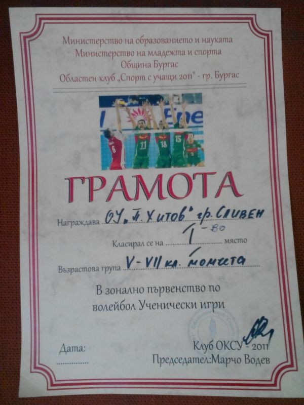 На 17 април2016 г. в град Бургас се проведе зоналния етап от Ученически игри 2015/2016 г. по волейбол за момичета 5-7 клас. Представители на сливенска област бяха учениците от Седмо основно училище „Панайот Хитов“ – Сливен, които преди това бяха станали градски и областни шампиони. На турнира нашите състезателки постигнаха категорична победа срещу отбора на Ямбол, но загубиха в тайбрек срещу отбора на Приморско след много оспорвани моменти и обрати