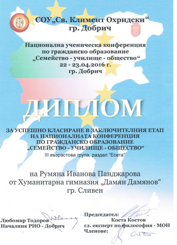 Според регламента, в конференцията могат да участват ученици от IV до XII клас, след предварителен подбор. Ученичката от Хуманитарна гимназия Румяна Панджарова от 10а клас участва в трета възрастова група с есе на тема „Семейство-училище-общество”, в което акцентира върху проблема за общуването в семейството, училището и обществото, за което получи ваучер за стипендия от Висшето училище по мениджмънт – гр. Добрич. За съжаление Руми не може да се възползва от този подарък, защото все още е в десети клас! Поздравяваме я за този първи успех!
