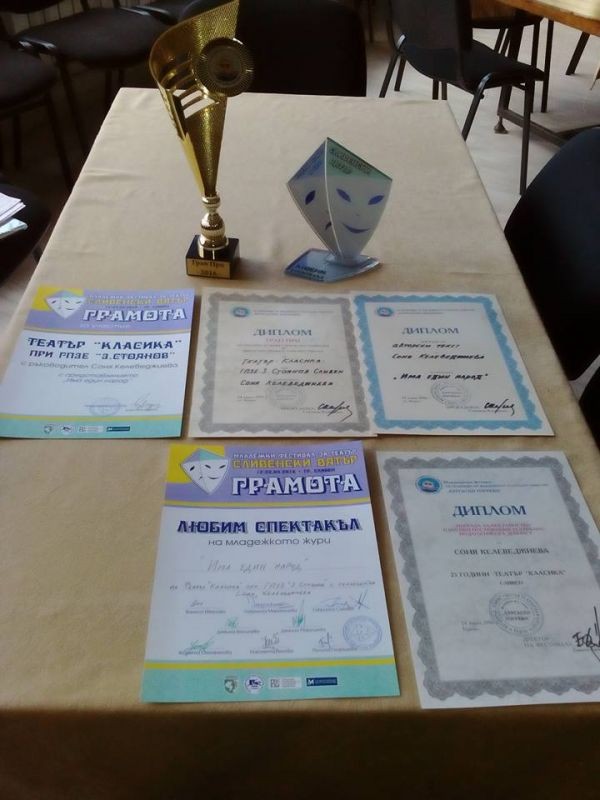 "Има един народ" на театър "Класика" при ГПЗЕ "Захарий Стоянов"- Сливен, след оспорвана „битка“ с таланти от Силистра, София, Бургас, Благоевград, Варна, Ямбол, Първомай, Лясковец, Горна Оряховица, Хасково, Крумовград и др. извоюва "Гран при" за 2016 година от XII Международен младежки фестивал "Бургаски изгреви". Соня Келеведжиева спечели награда за "Авторски текст", а с награди за "Най- магнетичен актьор на фестивала" и "Най- магнетична актриса на фестивала" журито с председател бургаския режисьор Станимир Карагьозов удостои Милица Атанасова /за ролята на Милка/ и Борис Реджев /за ролята на дядо Руси/, който спечели и наградата на "Бургаски културен афиш". Театрална формация „Класика“ бе наградена с Диплом за 25 години творческа дейност от XII Международен младежки фестивал.
