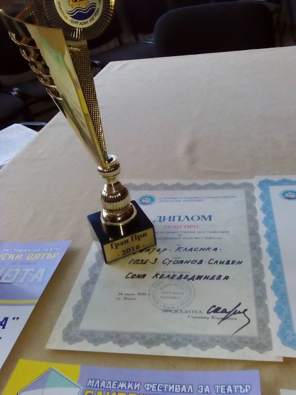 ТЕАТЪР „КЛАСИКА“ при ГПЗЕ „Захарий Стоянов“ с „ГРАН ПРИ“ от XII Международен младежки театлален фестивал „Бургаски изгреви“