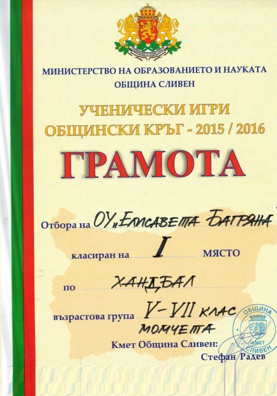 Учениците от ОУ „Елисавета Багряна” – Сливен си получиха заслужено 4 купи – 1-во място хандбал момичета, 1-во място хандбал момчета, 2-ро място футбол и 3-то място баскетбол момчета.