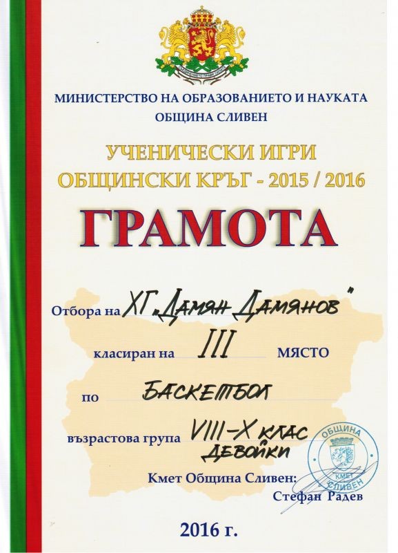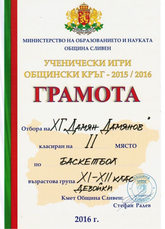 Учениците от Хуманитарна гимназия „Дамян Дамянов” – Сливен получиха заслужени купи и грамоти за 2-ро място футбол ХІ- ХІІ клас юноши, баскетбол ХІ- ХІІ клас девойки и 3-то място баскетбол VІІІ- Х клас девойки и юноши.