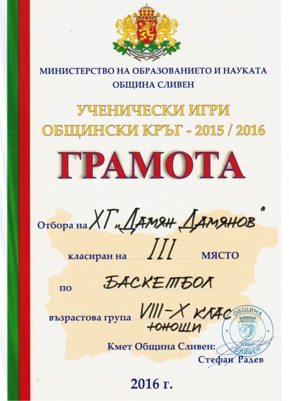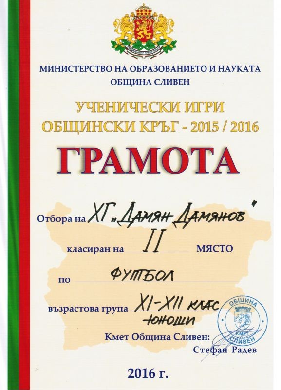 Учениците от Хуманитарна гимназия „Дамян Дамянов” – Сливен получиха заслужени купи и грамоти за 2-ро място футбол ХІ- ХІІ клас юноши, баскетбол ХІ- ХІІ клас девойки и 3-то място баскетбол VІІІ- Х клас девойки и юноши.