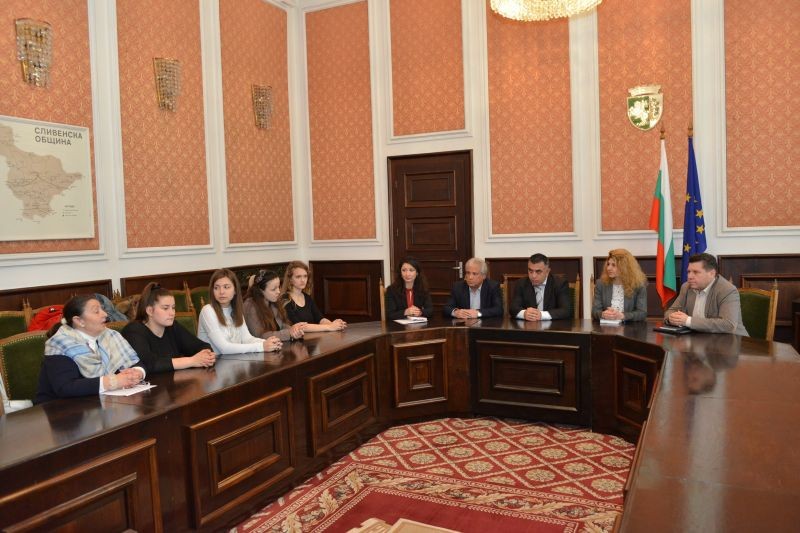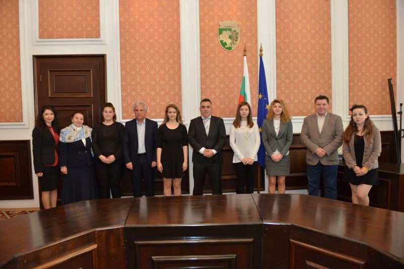 Учениците бяха посрещнати в официалната зала на общинската администрация от кмета Стефан Радев и неговите заместници Стоян Марков, Пепа Чиликова, Валя Радева, както и от председателя на Общинския съвет Димитър Митев.