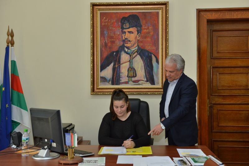 Учениците бяха посрещнати в официалната зала на общинската администрация от председателя на Общинския съвет Димитър Митев, кметът Стефан Радев и неговите заместници.