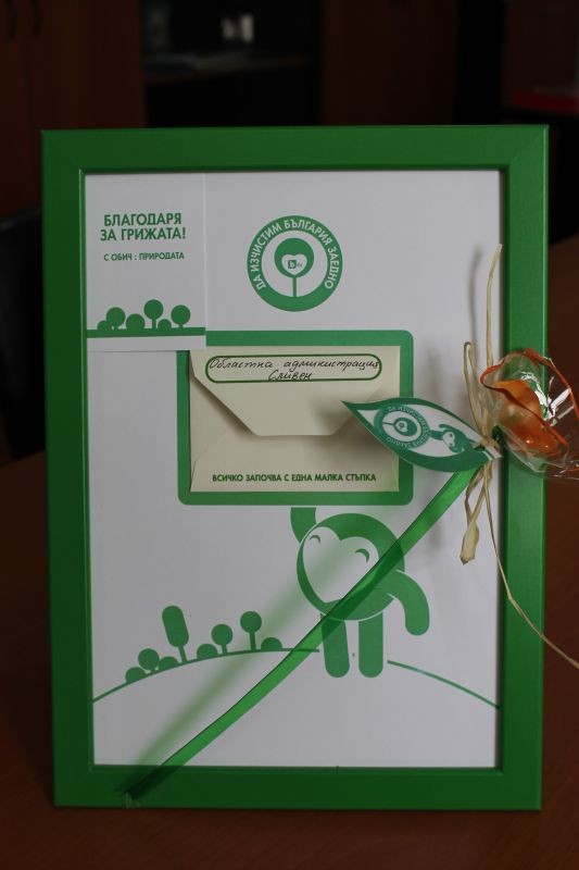 Там беше и областният управител на Сливен Татяна Петкова. Пред присъстващите тя подчерта, че вече 5 години в област Сливен успешно се обединяват усилията на държавна, местна власт и гражданското общество за почистване на прекрасната природа на областта. Резултатите, които се постигат, поставят област Сливен сред най-активните участници в кампанията. За това Татяна Петкова получи грамота от организаторите на кампанията.