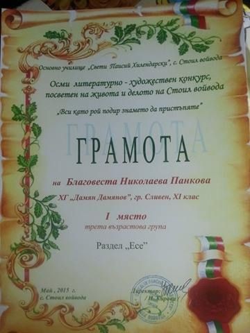 На 13.05.2016г. в с. Стоил войвода, общ. Нова Загора, се организира поклонение в памет на войводата от Априлското въстание - Стоил войвода. Организатор на събитието беше ОУ "Св. Паисий Хилендарски". По повод 140 години от Априлското въстание и гибелта на Стоил войвода и неговата чета се проведе и литературно-художествен конкурс "Вси като рой подир знамето да пристъпяте". В него участие взе ученичката Благовеста Панкова от XI клас при Хуманитарна гимназия "Дамян Дамянов", която спечели първо място в раздел "Есе".