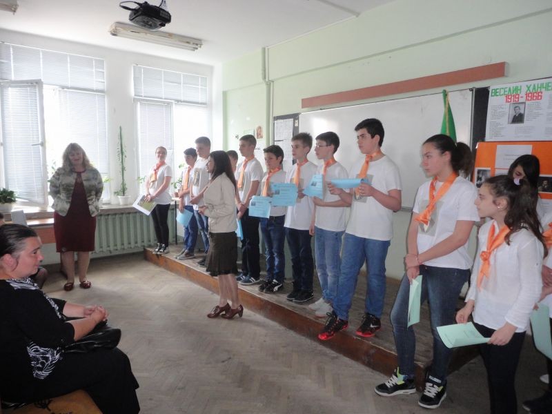 Госпожа Величка Христова - директор на ОУ „Елисавета Багряна” връчи грамоти за изготвените презентации за Априлското въстание и за участие в рецитал за Априлското въстание.
