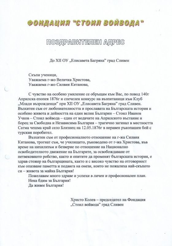 Госпожа Кристиана Станкова – старши експерт по обществени науки и гражданско образование в РИО –Сливен поздрави децата от клуб „Млади възрожденци” и им пожела да обичат българската история, да растат здрави, щастливи и да бъдат достойни българи.