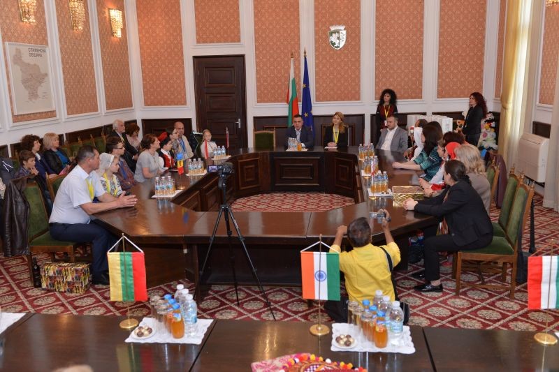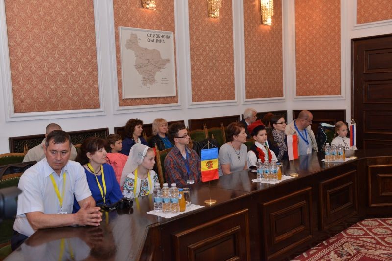 Кметът приветства гостите в сградата на общината, пожела им успех, приятни изживявания и много нови приятелства по време на престоя им във фестивалните дни. Той отбеляза, че Сливен е първият индустриален град, с богата хилядолетна история, която ни отвежда към времето на траки, римляни, славяни. “Надявам се да имате възможност да опознаете нашия красив град и да разказвате за него на Вашите сънародници! Поздравявам всички Вас, които съхранявате и предавате традициите на страната си!“, каза още Радев.