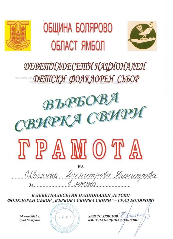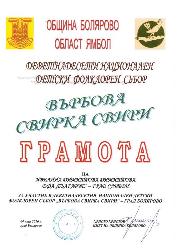 Ученичката от пети клас на Хуманитарната гимназия „Дамян Дамянов“ в Сливен Ивелина Димитрова се класира на първо място в Деветнадесетия национален фолклорен събор „Върбова свирка свири“, който се проведе на 4 юни 2016 г. в гр. Болярово, област Ямбол. Стотици почитатели и приятели на българското народно песенно творчество и танцово изкуство проследиха изпълненията на повече от 400 млади певци и певици, музиканти и танцьори. Компетентното жури с председател прочутата народна певица Калинка Згурова присъди на Ивелина първа награда. Да пожелаем на талантливото ни момиче нови успехи в народното пеене!