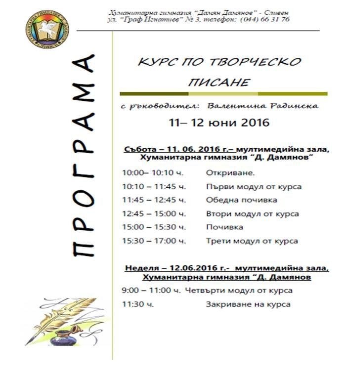 На 11 и 12 юни в Хуманитарната гимназия "Дамян Дамянов" ще продължи курса по творческо писане, воден от Валентина Радинска. Участниците в него са ученици от 5 до 12 клас, както от гимназията, така и от други сливенски училища. Курсът включва 4 занятия по 2 часа. Валентина Радинска ще продължи диалога си с младите творци-участници в проявата, ще обърне внимание на добрите и на слабите страни на новите им творби. В събота, по покана на водещата, сред младите творци ще бъде и Мирела Иванова, поетеса.