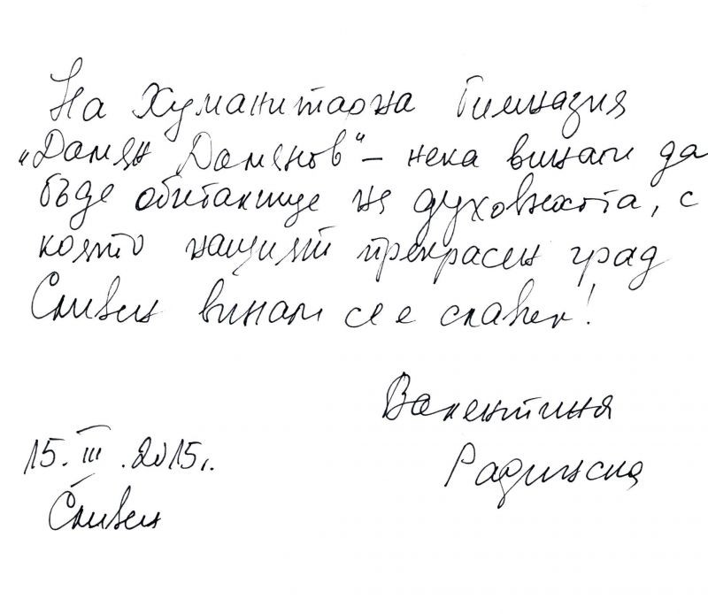 Идеята за курса по творческо писане се роди миналата година като отзвук на инициативата „Чети с мен” на Министерство на културата и Министерство на образованието и науката, под патронажа на президента на Република България. Ученици и учители ценим високо проявената от Валентина Радинска отзивчивост втора година да работи с млади дарования от родния си град. Стремим се да отговаряме с дела на посланието на поетесата Хуманитарната гимназия „Дамян Дамянов” „винаги да бъде обиталище на духовността, с която нашият прекрасен град Сливен винаги се е славил.”