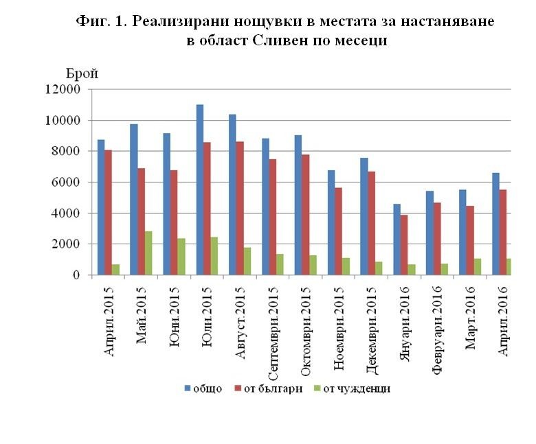 Общият брой на реализираните нощувки във всички места за настаняване през април 2016 г. в област Сливен е 6 610, като е намалял с 24.4% в сравнение с април 2015 година. Реализираните нощувки от български граждани са 5 533 и са намалели с 31.4% спрямо същия месец на предходната година. Увеличил се е броят на реализираните нощувки от чужденци с 58.8%, спрямо април 2015 година. Най-голям брой нощувки са реализирали чуждестранните граждани от Гърция 171, Италия - 136 и САЩ - 134.