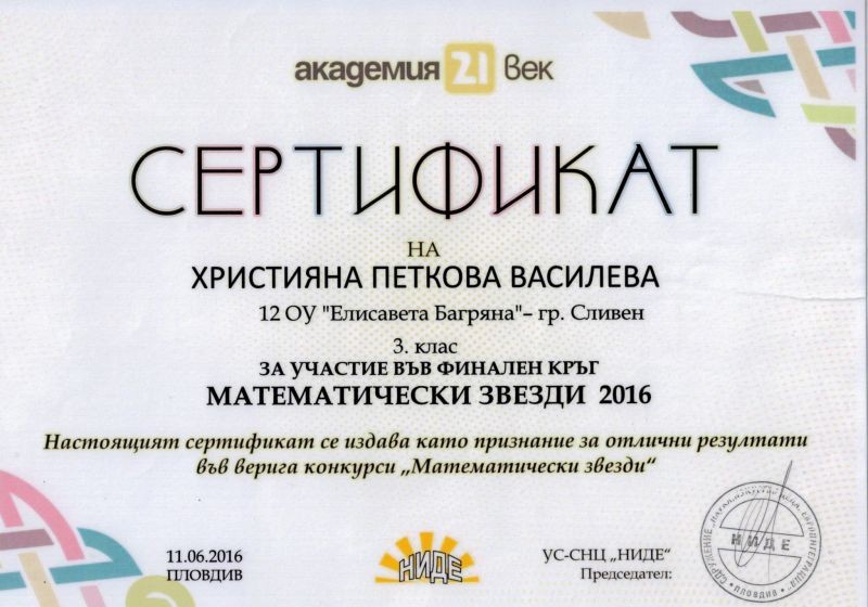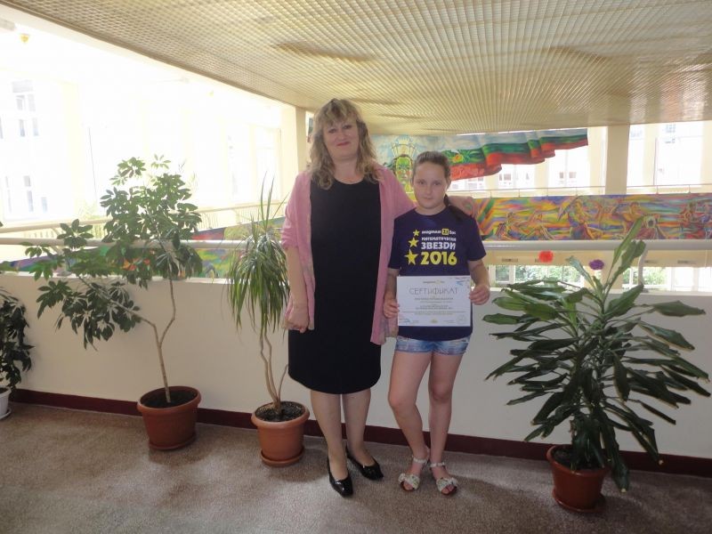Навън е жарко лято, а Християна Петкова Василева отново се изявява. На 11.06.2016 г. в град Пловдив се проведе финален кръг на Математически звезди 2016. Състезанието е организирано от Сдружение – Наука Изкуство Деца Евроинтеграция. Нашата математичка се подреди на шесто място със своя резултат и зае престижното осемнадесето място в квотата на България.