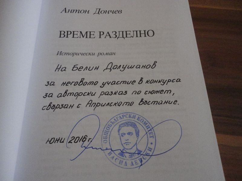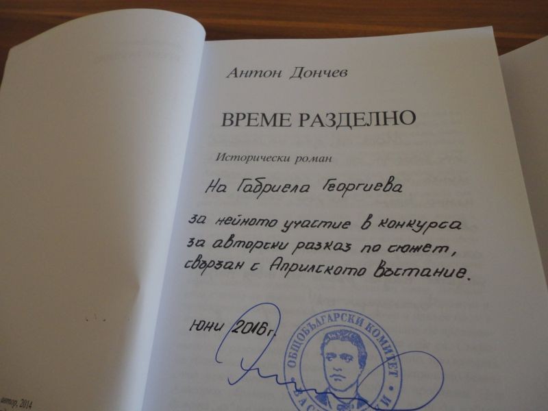 Като поощтрителна награда за оригиналните си и стойностни творби Белин Долушанов и Габриела Живкова от VI „в” клас получиха персонален екземпляр от книгата на академик Антон Дончев „Време разделно”.