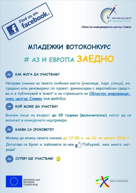 Областен информационен център - Сливен, съвместно с Младежки дом, организира фотоконкурс на тема „Аз и Европа ЗАЕДНО“. Целта на инициативата е да се покажат осъществени проекти с помощта на европейско финансиране, както и да се представи значението им за местната общност. Конкурсът ще се проведе от 20 юли до 10 август и е по повод отбелязването на Международния ден на младежта – 12-ти август.