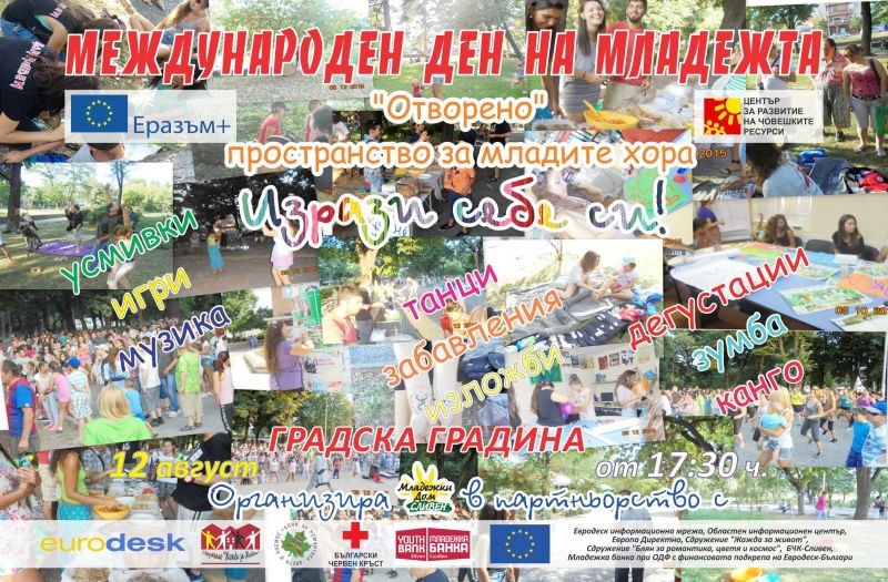 Община Сливен и Младежки дом организират "отворено" пространство за младите хора от града под мотото ”Изразете мнението си”. Проявата ще се състои на 12 август от 17.30 часа в градската градина и е по случай Международния ден на младежта. Събитието се организира съвместно с Евродеск информационна мрежа, Областен информационен център, Европа Директно, Сдружение „Жажда за живот”, БЧК - Сливен и Младежка банка при ОДФ.