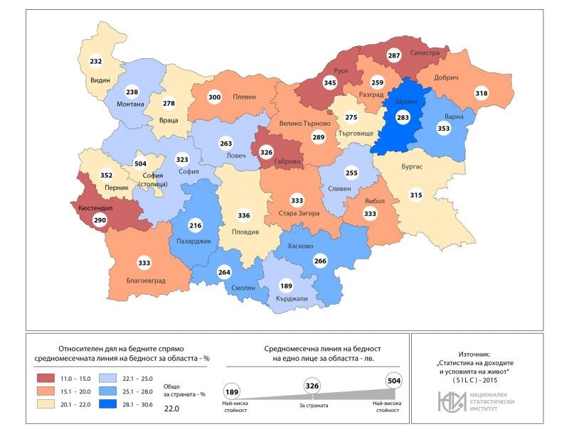През 2015 г. най-ниската линия на бедност се наблюдава в областите Кърджали и Пазарджик - съответно 189 и 216 лв., а най-високата - в област София (столица) (504 лв.), следвана от областите Варна (353 лв.) и Перник (352 лв.).