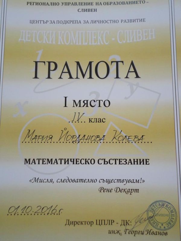На 1.10.2016 г. Регионално управление на образованието – гр. Сливен и Център за подкрепа на личностното развитие проведе Математическо състезание „Мисля, следователно съществувам”.