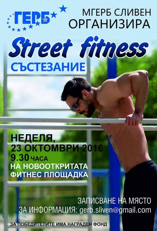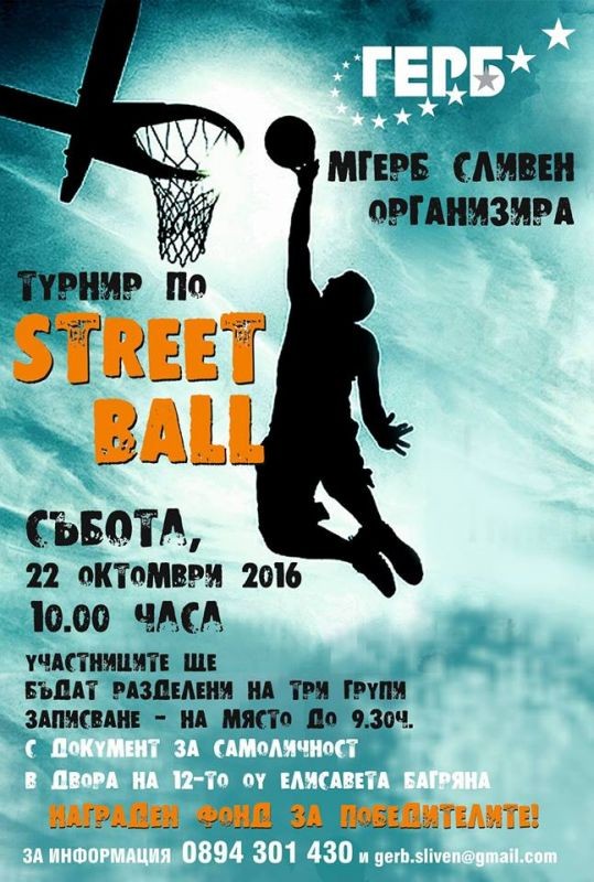 МГЕРБ – Сливен организира турнир по Street ball- Уличен баскетбол, Street fitness и Футбол на малки вратички. Турнирът на по Street ball ще се проведе на 22.10.2016 година (събота) от 10.00 часа в двора на ОУ „Елисавета Багряна“ –Сливен. Записването за участие ще става на място в 09.30 часа в двора на учебното заведение. Вторият турнир, който организира младежката организация ще се проведе в неделя, 23.10.2016 година от 10.00 часа на новоизградената площадка за Street fitness на булевард „Панайот Хитов“ в Сливен. Футболът на малки вратички е с начален час 09.30 часа и ще се състои на 30-ти октомври, неделя в спортен комплекс-ДЕКОТЕКС. Отборите са в състав от 6 души(5+1 вратар). За победители е осигурен награден фонд. Моля изпращайте заявките за участие на е-mail адрес- gerb.sliven@gmail.com. За повече информация- 0894301430.
