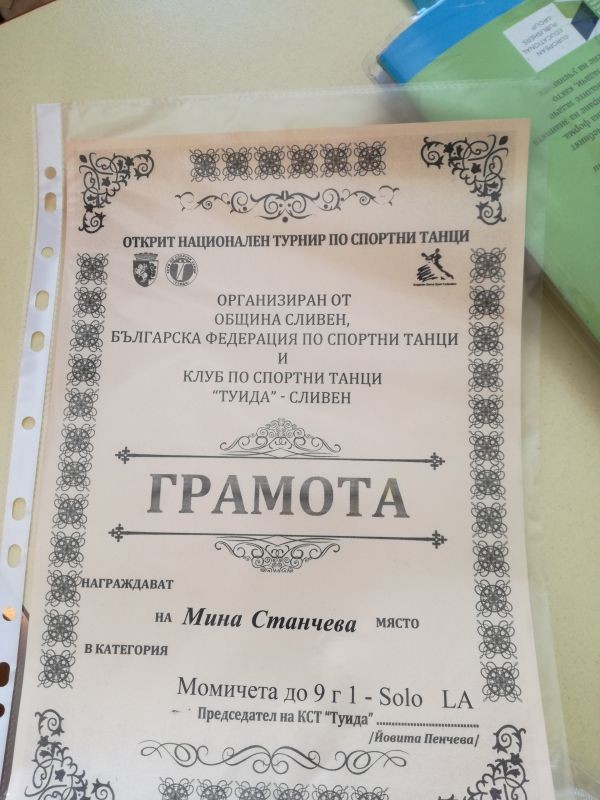 Ученичката Мина Диянова Станчева от Основно училище"Панайот Хитов" град Сливен - II а клас спечели второ място в турнир по спортни танци "Изгряващи звезди", проведен на 29.10 2016 година в градът на стоте войводи.