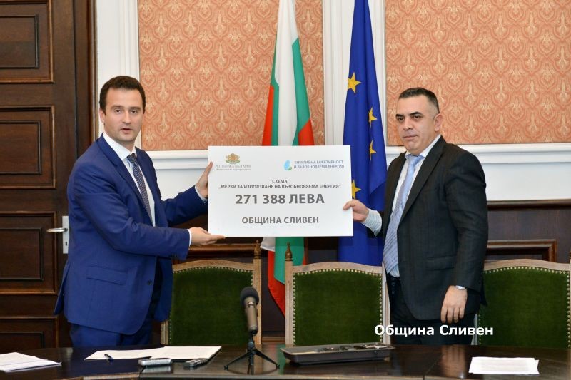 Заместник-министърът на енергетиката Жечо Станков връчи на кмета на Сливен Стефан Радев чек на стойност 271 388 лева като допълнително финансиране по проект за подобряване на енергийна ефективност в общински сгради. Средствата ще бъдат използвани за спортна зала „Васил Левски” и ПХГ „Дамян Дамянов”. Това стана на брифинг пред журналисти, на който присъстваха и заместник-кметовете Стефан Кондузов и Стоян Марков.