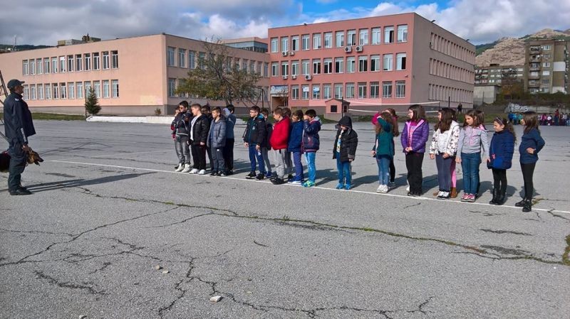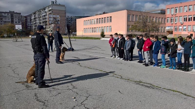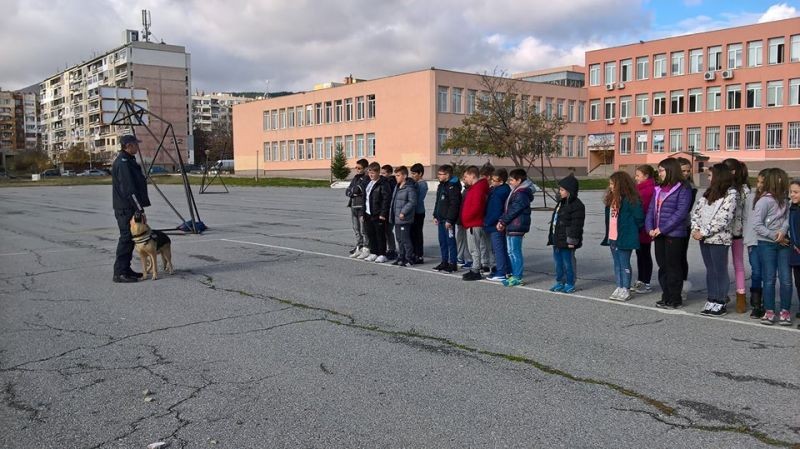 На 10.11. в ОУ „Елисавета Багряна” се проведе петото по ред занятие по програмата „Детско полицейско управление” с учениците от IV „а” клас. Служителите в група „Охрана на обществения ред” към РУ – Сливен запознаха децата с работата на полицейските кучета, в какви полицейски дейности се използват тези животни и през какви обучения преминават. Полицейските кучета, Рекс и Ян, показаха своите умения в изпълнение на команди от водачите си, в търсене по следи и залавяне на нарушител на закона.