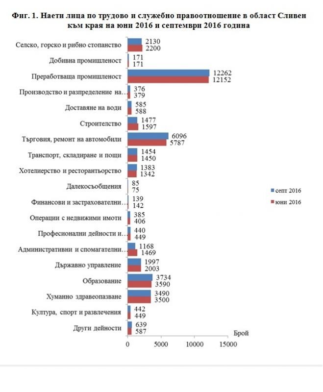 По предварителни данни на Националния статистически институт (НСИ) наетите лица по трудово и служебно правоотношение в област Сливен се увеличават с 0.3% спрямо края на юни 2016 и към края на септември 2016 г. достигат 38.4 хиляди (фиг. 1).