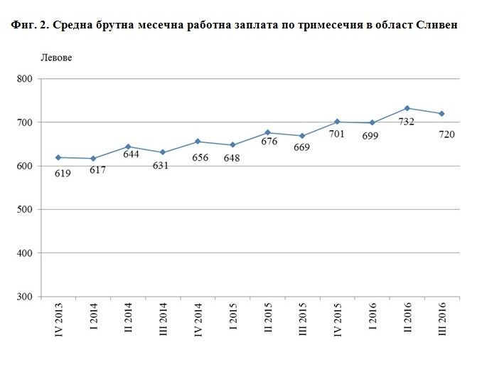 През третото тримесечие на 2016 г. средната месечна работна заплата за област Сливен нараства със 7.6% в сравнение с третото тримесечие на 2015 година (фиг. 2).