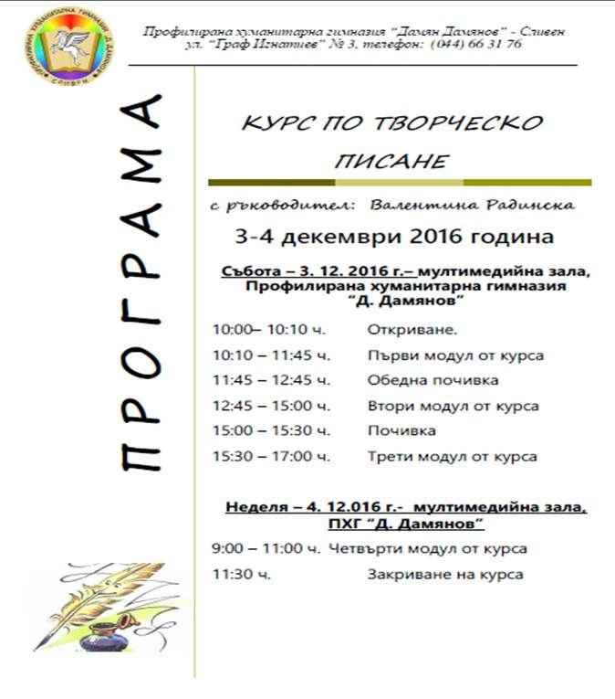 На 3 и 4 декември 2016 г. в Профилирана хуманитарна гимназия „Дамян Дамянов” ще продължи курсът по творческо писане, воден от поетесата Валентина Радинска. Участници в него могат да бъдат ученици от 5 до 12 клас от училищата в област Сливен.