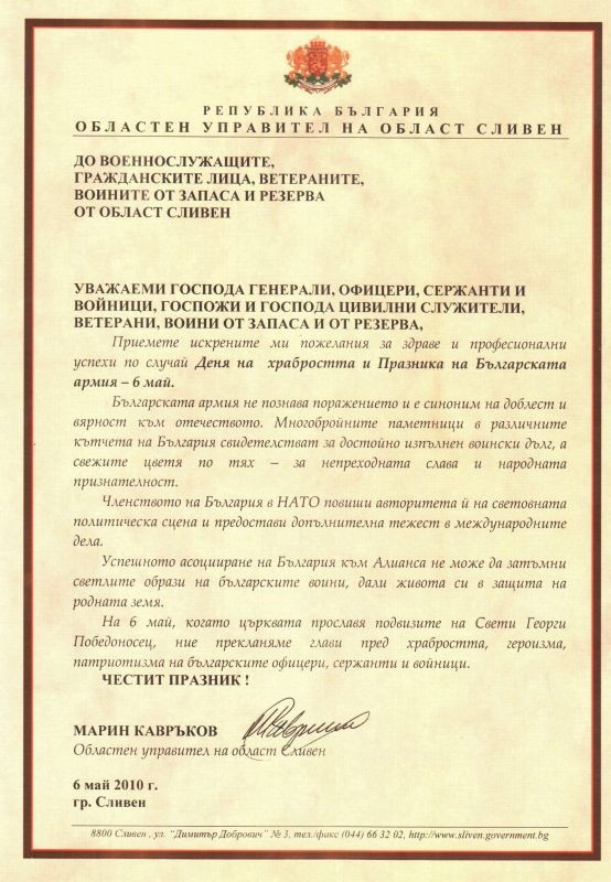 Областният управител г-н Марин Кавръков поздрави военнослужещите, цивилните служители, ветераните, воините от запаса и резерва от област Сливен по повод 6 май - Деня на храбростта и Празника на Българската армия!