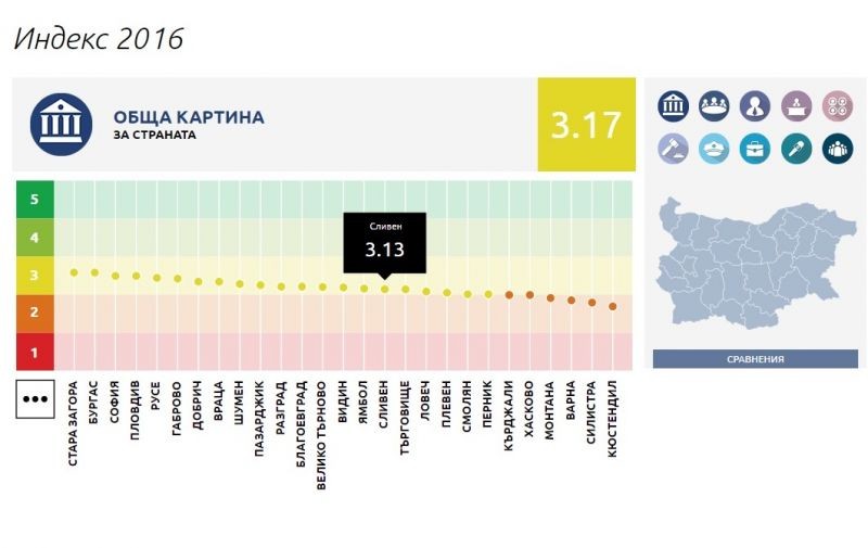 Като най-почтени са се представили Стара Загора и Бургас (3,57) и София (3,48). Общата стойност на индекса на Местната система за почтеност за 2016 г. е 3.17 точки при максимална стойност 5. Индексът регистрира минимално повишение спрямо резултата от 2015 г. (3,14). Кюстендил, Силистра и Варна (за втора поредна година) са на дъното на класацията с най-слаби показатели за отчетност и почтеност. Сливен е в средата на класацията с 3,13.